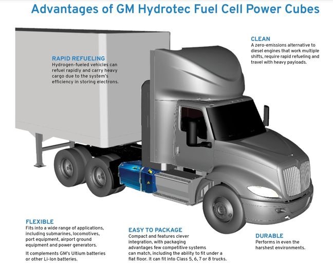 GM, Navistar, and OneH2 are collaborating for a hydrogen-fuel semi truck, which is making its way to customers by 2024. GM’s Hydrotec fuel cell power cubes operate with high energy density and a per-mile cost comparable to diesel, in some instances. Other features unique to the Hydrotec Fuel Cell Power Cubes include faster refueling, scalable production for other transportation applications, the ability to work in harsh conditions, and the ability to fit Class 5,6,7, and 8 trucks.